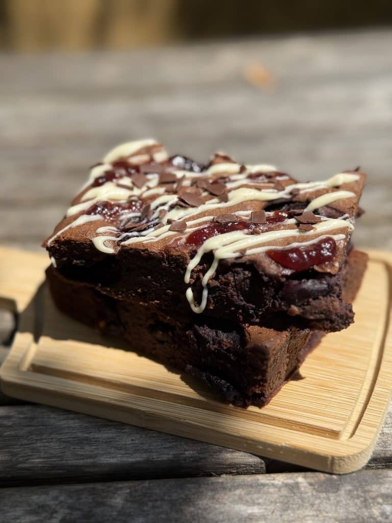 Brownie chocolat noir intense, agrémenté de cerises juteuses. Un topping au chocolat blanc, parsemé de copeaux de chocolat noir et nappé d’une touche de confiture de cerises… explosion de saveurs garantie. 🍒
