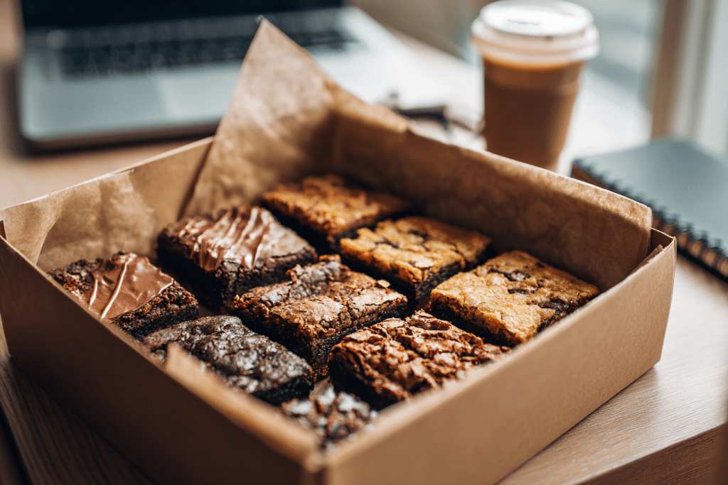 - Un abonnement mensuel avec une box surprise de 6 brownies livrée dans vos locaux : une touche de douceur régulière pour vos équipes !